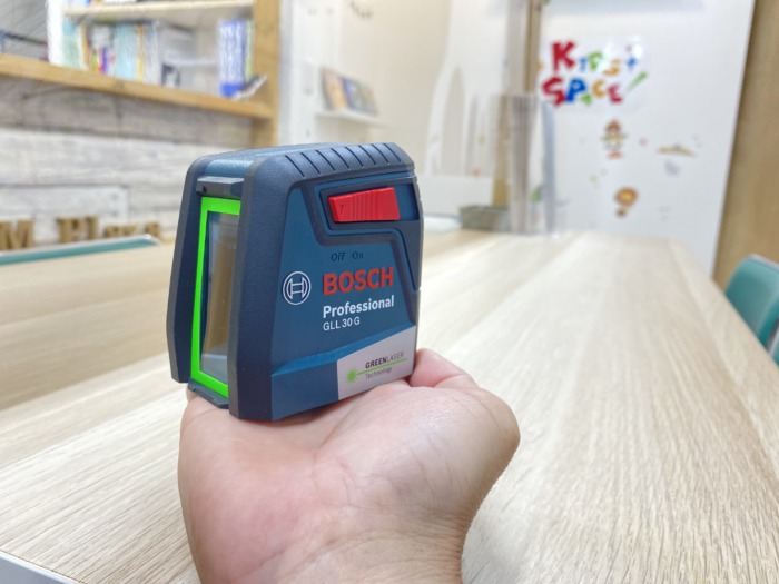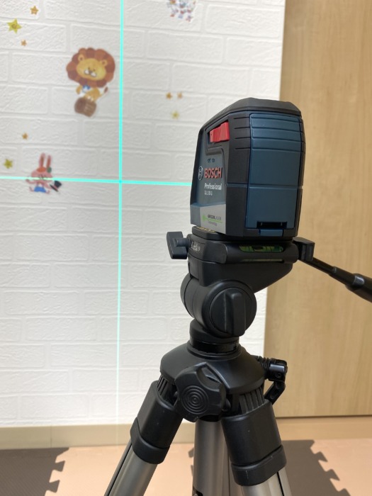 水平・垂直のラインを緑色のレーザーで室内の壁に投影する機械👍