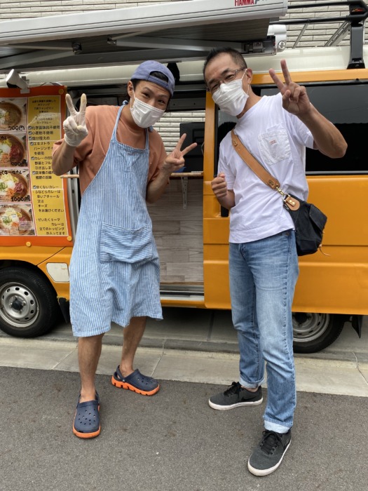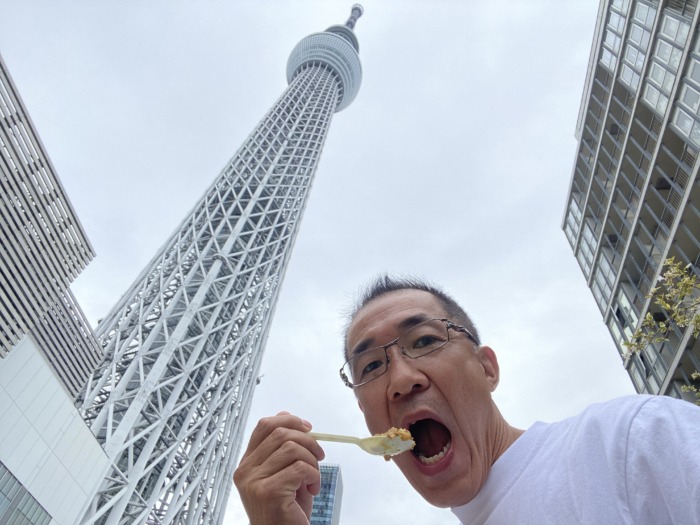 キッチンカーの前で昭和なポーズで記念撮影のあとスカイツリーの真下で美味しくいただきました✌️