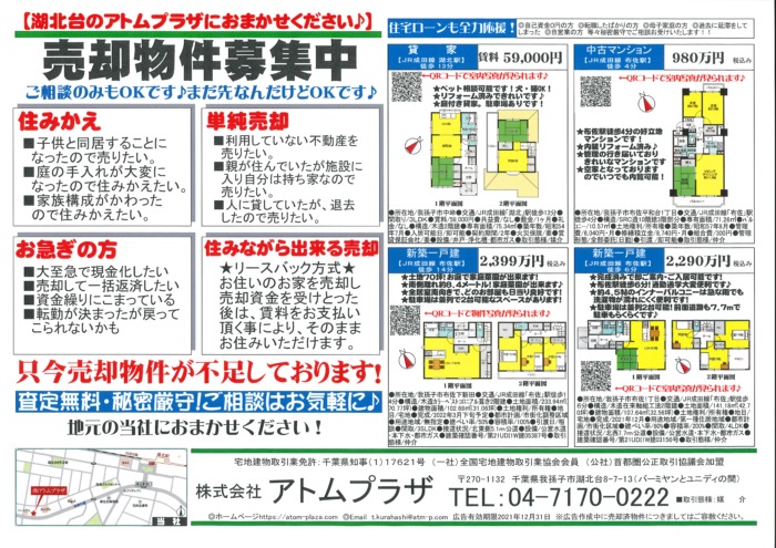②面は、売却物件の大募集♪ と貸家・中古マンション・土地広新築一戸建等いろいろご用意いたしました!