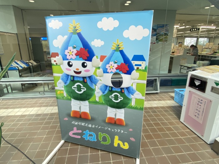 役場のロビーには、町の公式イメージキャラクター『とねりん』がお出迎え😊